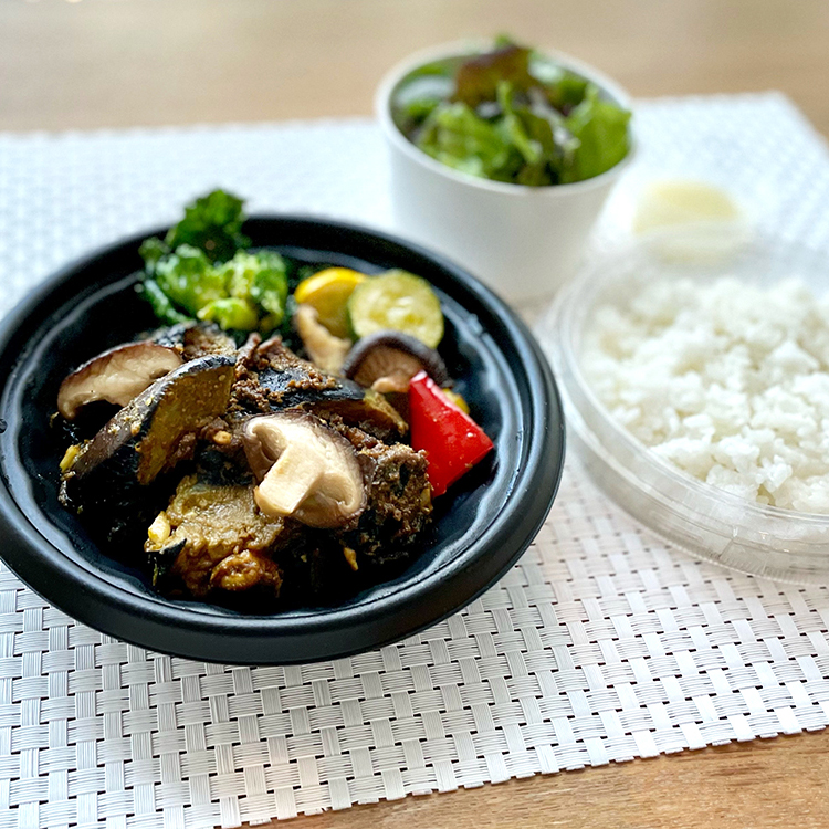 東京産ハウスなすの食感が絶妙な味わいの宮本シェフ自信作のビーガンカレーです。