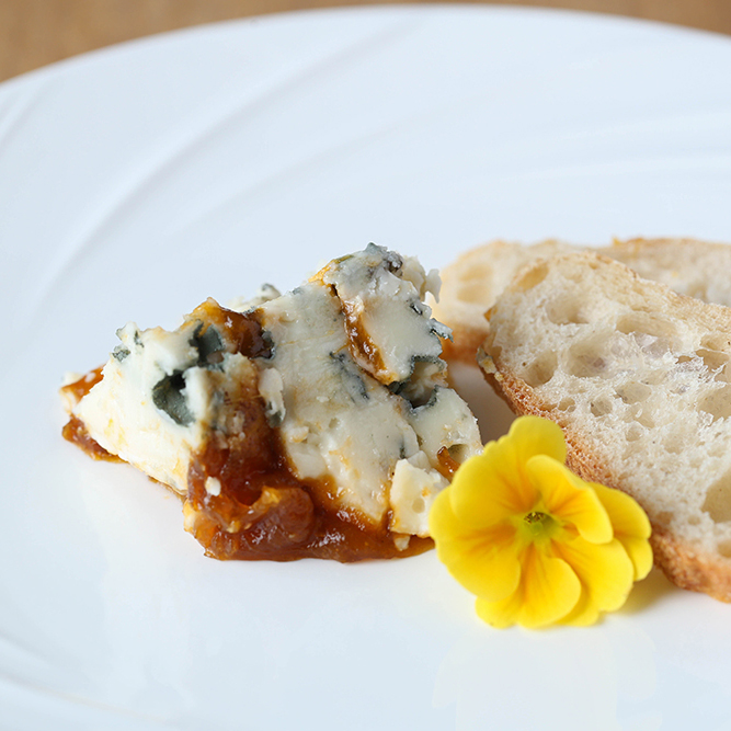世界三大青カビチーズ「ロックフォール」と、あんぽ柿をキルシュで洗って風味をつけたマーマレードにしてミルフィーユ状にサンドしました。あんぽ柿の甘さとチーズの塩味が相性抜群の一品です。ソーテルヌワインとのマリアージュをお楽しみください。